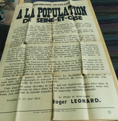 « À la population de Seine-et-Oise » signée du préfet, Versailles le 25/08/1944 ; archives départementales de Seine-et-Oise cote 1W417
